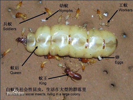 一巢成齡的臺灣乳白蟻,它們的成員有蟻皇、蟻后、兵蟻、工蟻。若蟻等。它們的結構式非常之嚴謹,品級分工清楚,蟻皇授精,蟻后產卵,兵蟻守衛(wèi),工蟻覓食勤務,若蟻待成熟長翅,分飛自立成巢。白蟻怕光,喜陰暗潮濕的環(huán)境。工蟻外出覓食,將食物消化轉換成養(yǎng)分,喂養(yǎng)巢內各品級白蟻,白蟻個體與個體之間營養(yǎng)均衡,相互清潔身體,相互撫慰,主要造成我們家居破壞的是工蟻——“破壞王”,它們尋找食物的半徑約100米。