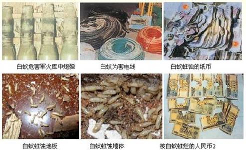 白蟻還能危害圖書、文物、織物、武器、帳冊(cè)、錢幣、地下電纜等,造成重大損失。古廟宇的大梁被蛀斷,地下通訊電纜被蛀造成電信中斷,銀行金庫也難以幸免,人民幣被蛀等。